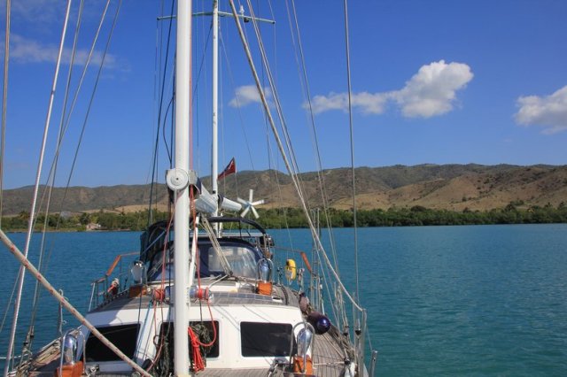 We were looking forward to a stop in Tiburcio bay as other cruisers had done, the bay was surrounded by reef so very protected. It was a good job we had recorded our track on the chart plotter going in, as at 5pm the same guarda dog handler turned up to tell us that we were not allowed to anchor there. There was one other boat in the bay and we were both forced on to the next bay at Pilon where there is a town and guarda post. Our final stop on the mainland was at Cabo Cruz on the south east corner, the reef extends out by over 2 miles but makes a nice wave break to anchor behind. Despite being anchored almost 2 miles offshore in a 20 knot brisk breeze the guarda was soon on the scene with his trusty rowers. The father and son fisherman were easy to understand with the help of our phrase book, and we soon established that the belt had broken on their engine, lucky for them we have a good supply of spare V belt for our generator and Jez gave them the length they needed. After a celebratory shot of Jamaican rum each and a strip of paracetamol for the forthcoming headache, they were towed off by a fellow fisherman back to the village. The guarda had invited us ashore in the morning to collect our paperwork, usually forbidden anywhere without a marina. Within an hour a diver appeared at the boat holding up two lobsters for us. All he wanted in exchange was some soap for his 3 year old child, we threw in some toothpaste and a small amount of money and he disappeared into the waves. In the morning the new shift of guarda, unfortunately for us, had other ideas about us going ashore and had rowed themselves out at 7.30am to return our papers, we had to move on. With a strong wind but variable direction we set out along the coast in shallow waters to our first night of freedom.