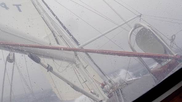 Generally speaking a squall will bring an extra 15+ knots of wind and torrential rain. The following day with a mean wind of 20 knots and a dark cloud coming our way, we rolled away the poled out jib leaving just the staysail and set the main with 2 reefs. Torrential rain flattened the sea and the wind built to 41 knots, Jez took over the helm from the autopilot to keep us downwind and prevent gybing. We cheered at 8.5 knots of boat speed, and clocked up 10 knots surfing the back of a wave. We were sailing and making progress at last!