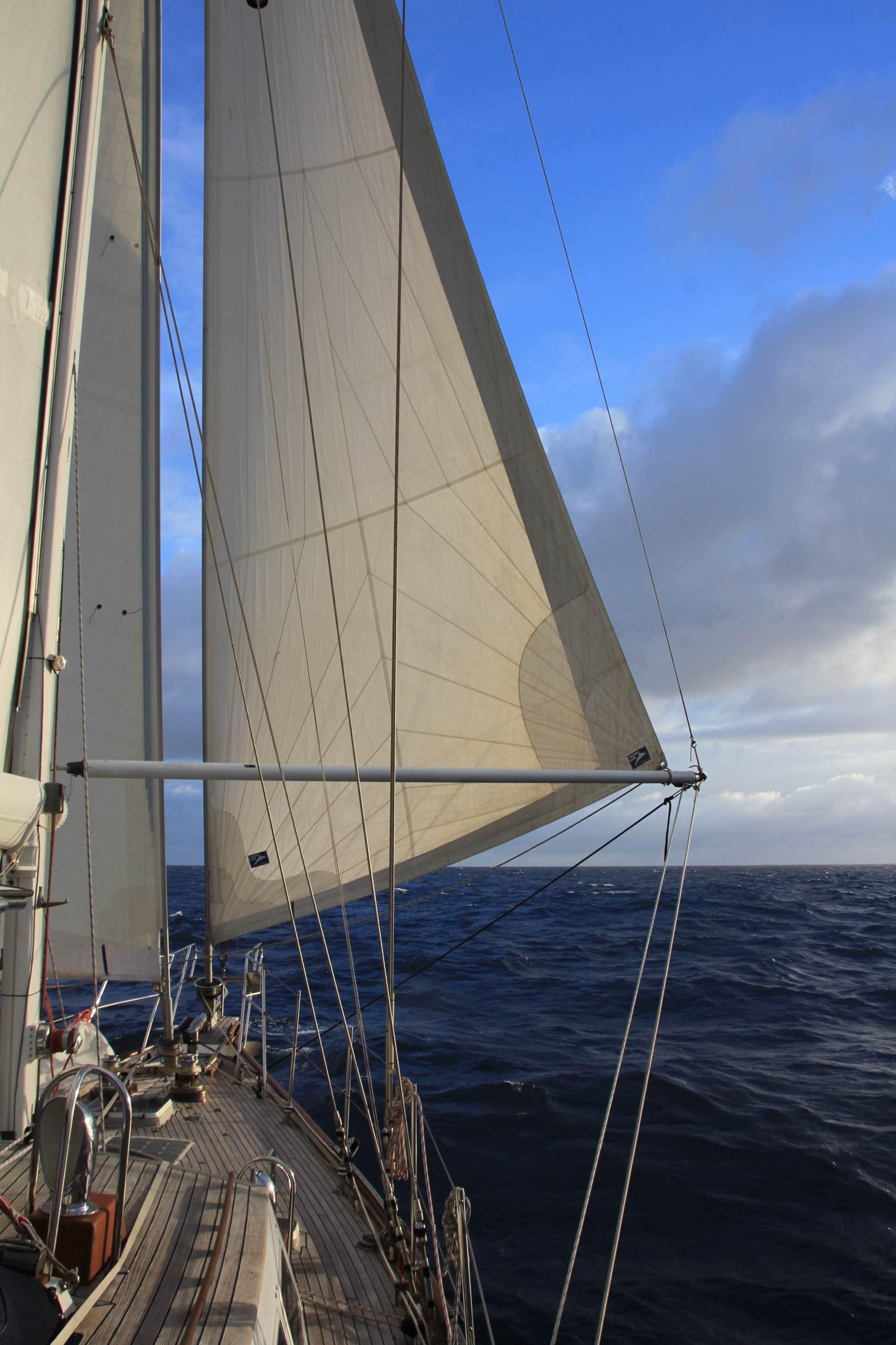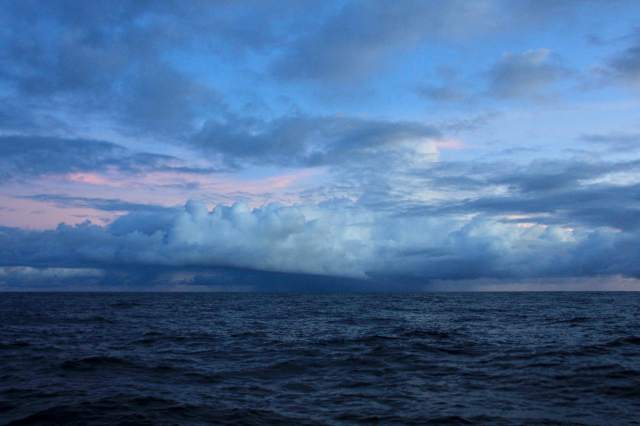 As we started to approach the ‘Inter-Tropical Convergence Zone’ at around 4° N, the asymmetric sail was put away mainly due to the threat of squalls. The wind had increased slightly so we set up our pole attached to the main mast and poled out the jib sail on the starboard side and set the staysail on the port. This is a good down-wind set up but does have a tendency to make the boat roll from side to side. We were pleased we had made the change as that very night the first of many squalls hit.