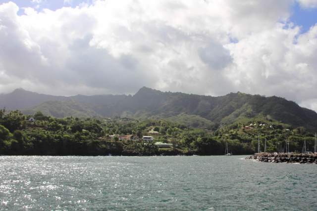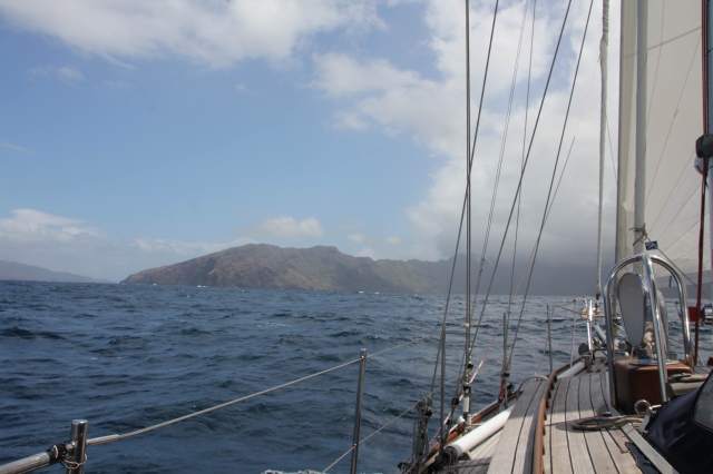 Our racing speed knocked a little over 24 hours off of our anticipated arrival, at 6am shift change yesterday we sighted land on the hazy horizon and by 8am we were off the north east point of the Marquesan island, Hiva Oa. The last few hours sailing along the south coast went back to bobbing with a drop to 12 knots in wind and the occasional rain shower.